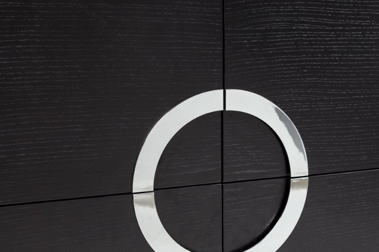 Одновременно вместительный и стильный, комод Lotus будет отличным дополнением для интерьера в стиле хай-тек, особенно хорошо он будет смотреться в сочетании с бытовой техникой: большим плазменным телевизором, аудиосистемой, колонками. В этом комоде — четыре отделения. Он выполнен из дерева чёрного цвета, имеет квадратный фасад с четырьмя дверцами, а посередине расположены ручки из хромированного металла, соединенные в круг. Такое сочетание форм и цветов смотрится одновременно просто, и в то же время необычно, привлекает внимание. Комод Lotus черный