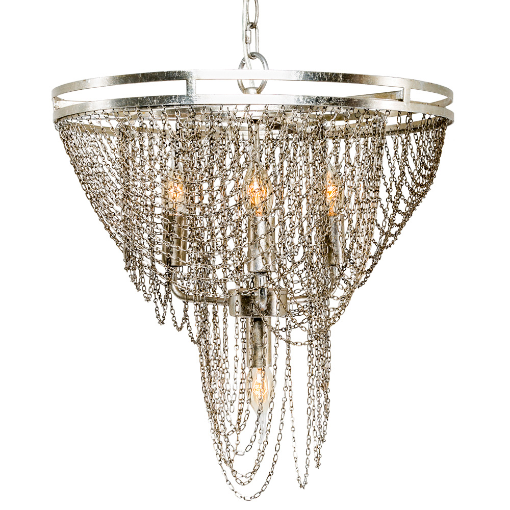 Размер: Ø 46,5 см, высота 66,5 см (без учета длины подвесной цепи) Длина подвесной цепи: приблизительно 1,5 м, регулируется согласно планировке владельца Количество ламп: 4 Тип электрической лампы: E14 Продается без ламп Материал: металл Цвет: серебряный Размер в упаковке: 54×54×40 см Вес: 3,4 кг, вес в упаковке: 5 кг
